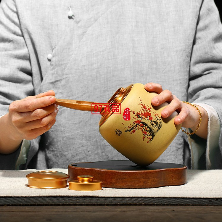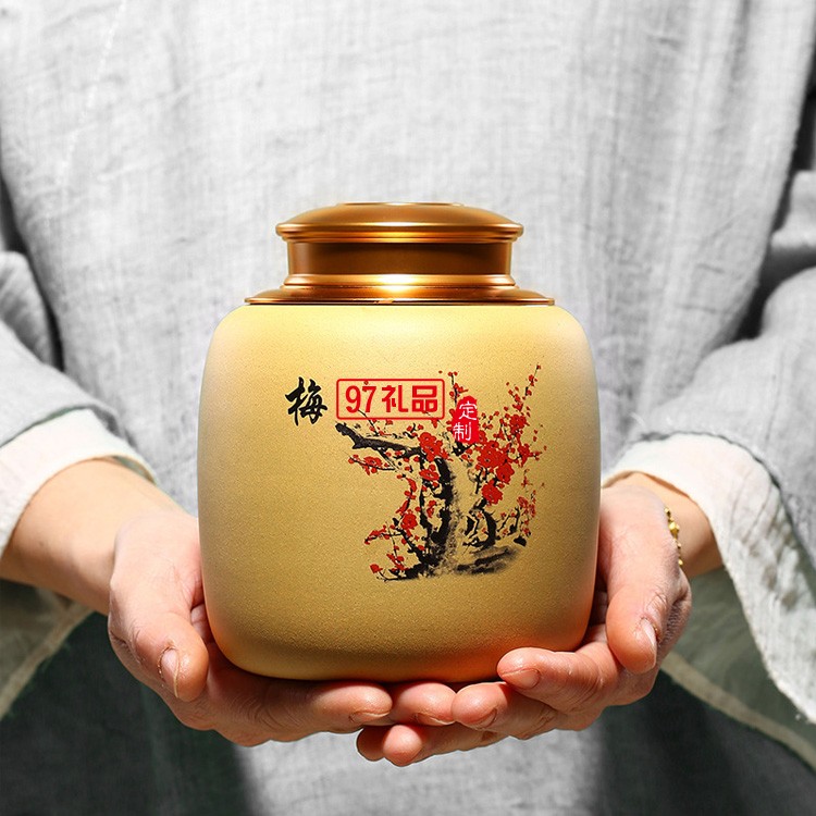 紫砂彩繪梅蘭竹菊茶葉罐原礦段泥陶罐茶葉缸定制公司廣告禮品