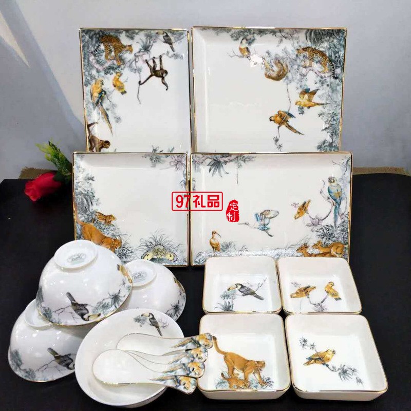 HERMES”愛馬16頭骨陶瓷鎏金餐具套裝赤道叢林系列方形盤碗碟勺禮