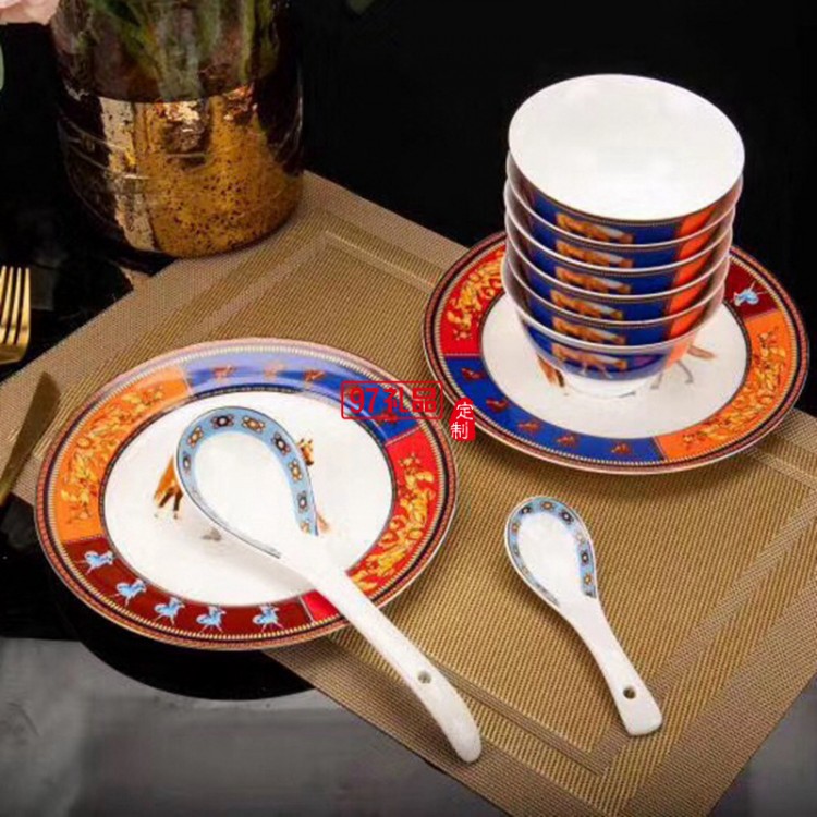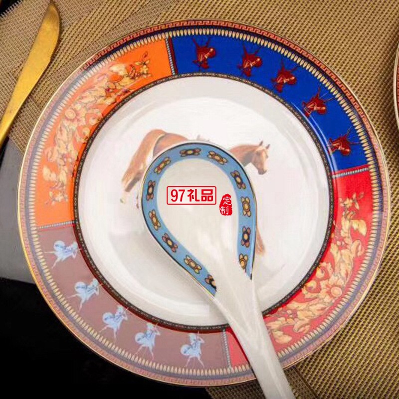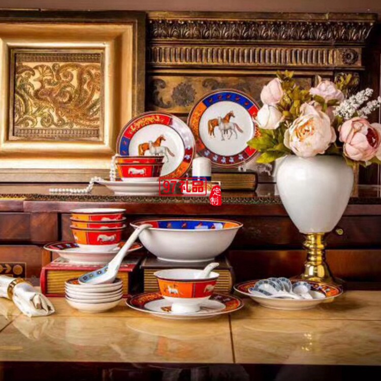 愛馬HERME白馬圖高檔骨瓷餐具28頭套裝禮盒碗盤碟瓷器歐式奢華