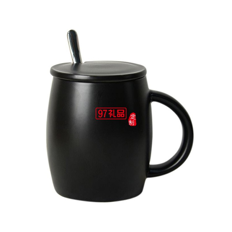 陶瓷水杯 450ml帶蓋帶勺馬克杯 亞光酒桶咖啡杯禮品杯子定制